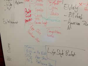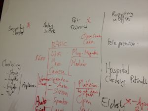 The Team In the end I decided Robotic team, as they had no business person (yes I wanted to code, next time), I had never worked on a physical product before and I knew I would enjoy working with Justin (he has sooo much of energy, and surprisingly he works at Microsoft!). We moved quickly to find the best location, a window for light, a white board and near where the food would be setup.. The team consisted of Justin @jzwoo (Microsoft engineer) – standing at the back, Guru (Microsoft engineer) sitting down on the left , Elijah (Interior Designer) hiding at the back on the left and me (the nutter in red). Justin basically wanted to find a business model excuse for playing with robots! We brainstormed use cases, the strongest seemed to be: