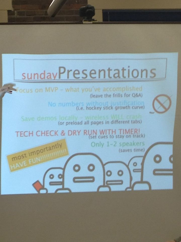 About 4pm we chose our pitch position. Our team felt going near the end to help us buy more time to get the robot ready, so we might learn from the other pitches and be more likely to be remembered by the judges after 14 pitches (a lot to remember). We ended up pitching last!