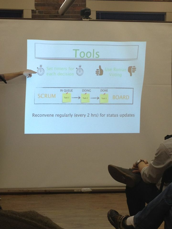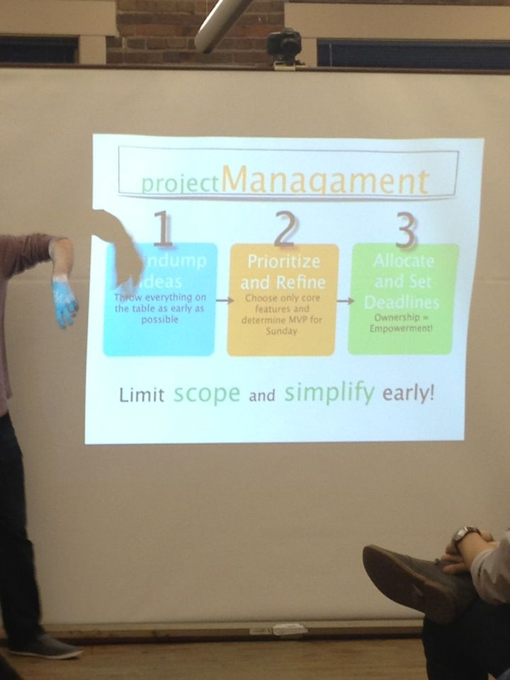 During the day, teams stopped for 15 minutes to give each other updates with where they were, including accomplishments and problems. Most teams stayed in the same space which kept the energy high. I believe a couple of teams went to a VC’s office and another some other office space. http://www.youtube.com/watch?v=pH9Gx_IdLic&feature=related